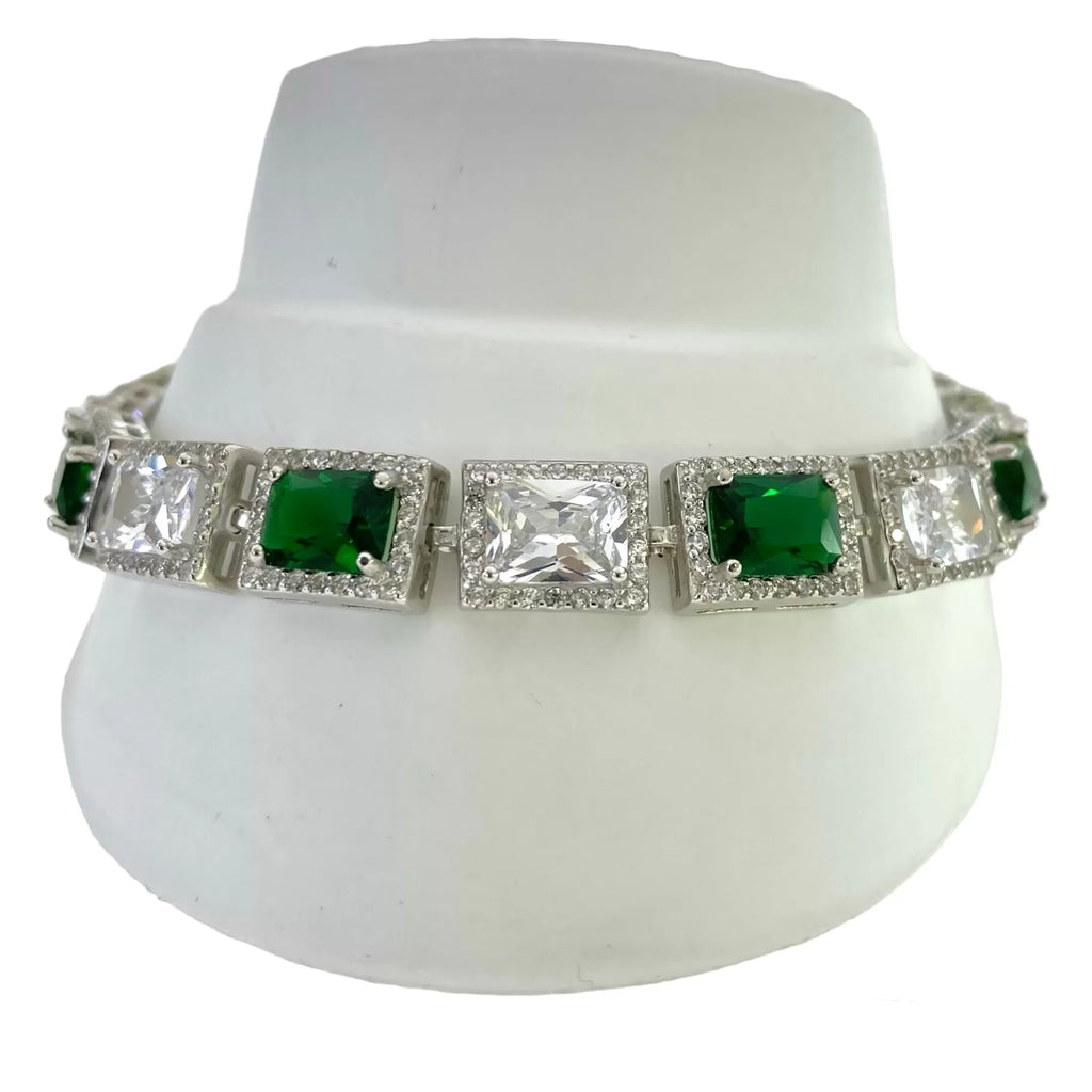 PULSERA RECTANGULOS VERDE Y BLANCO ZIRCONIA - PLATA .925