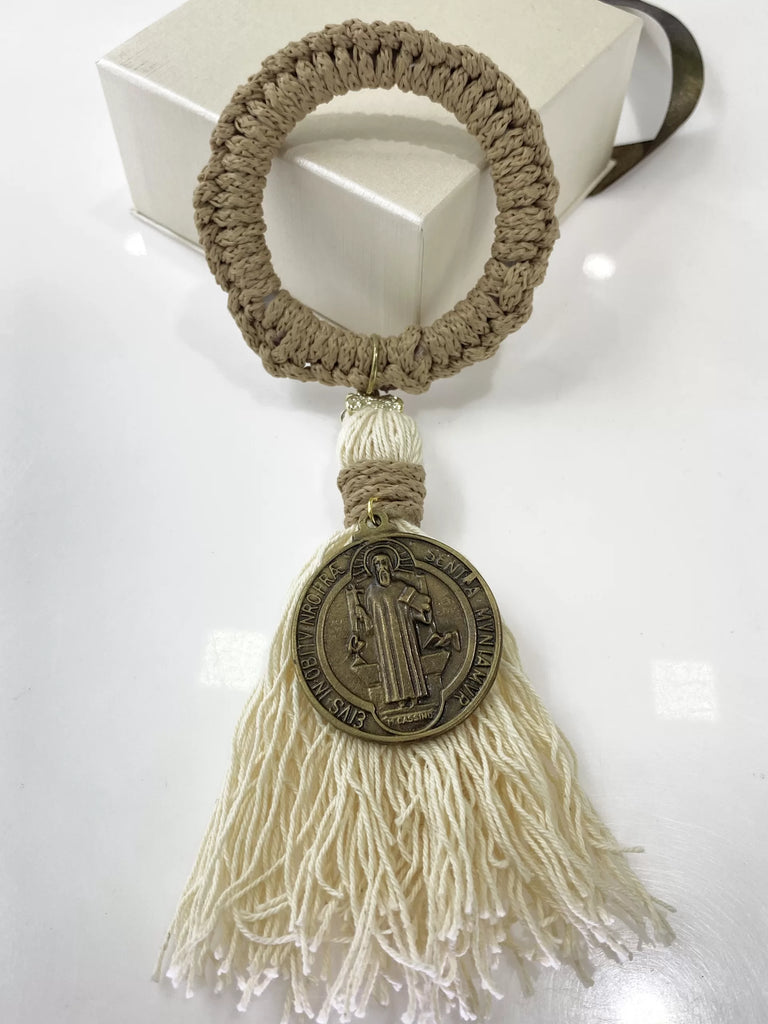 ADORNO BENDICIÓN ARO CAPUCCINO Y MOTA DE HILO CON MEDALLA SAN BENITO ABAD