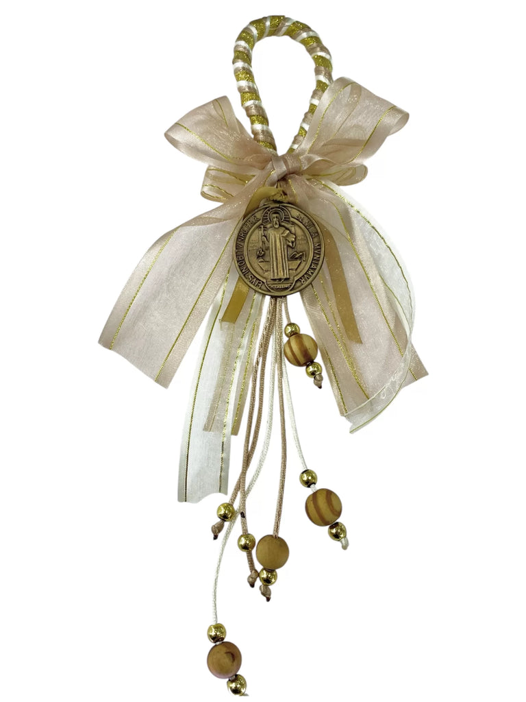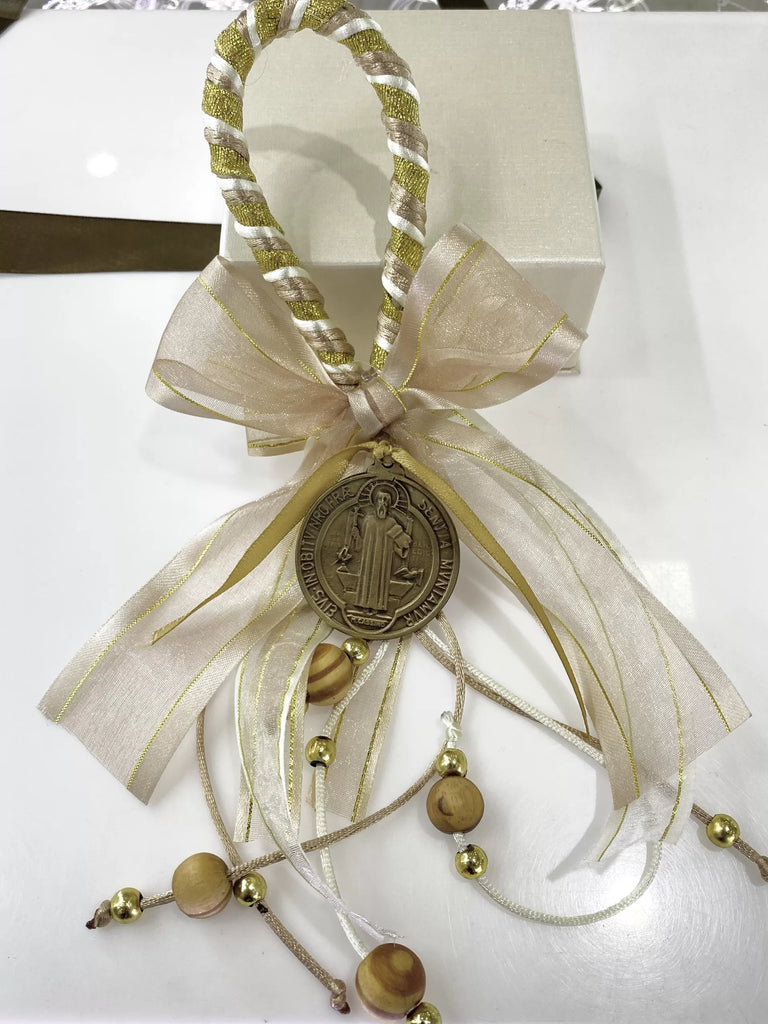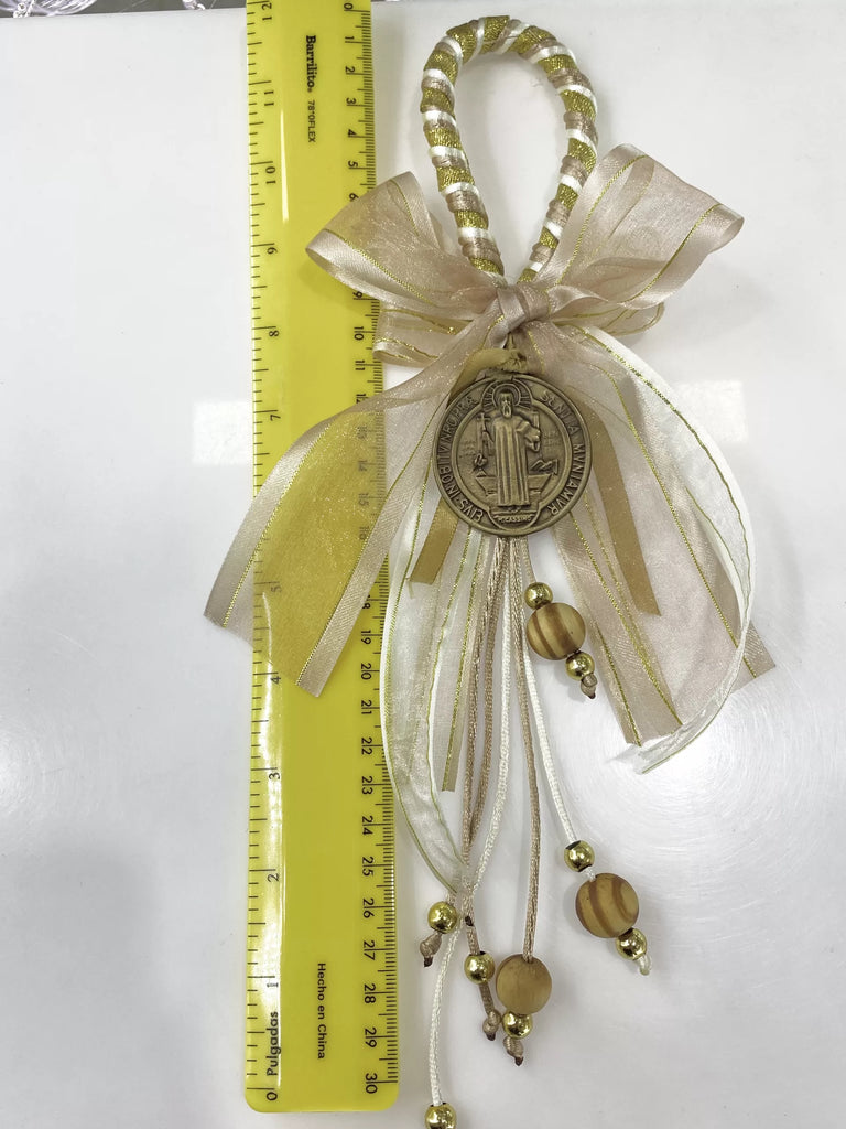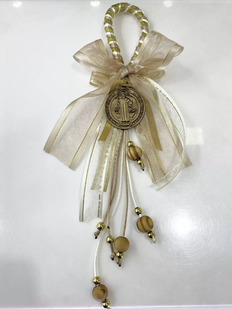 • Descripción: ADORNO BENDICIÓN COLA DE RATA DORADA CON MEDALLA SAN BENITO ABAD