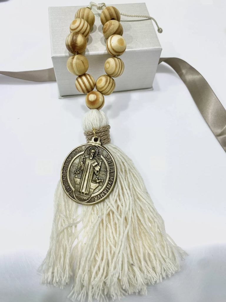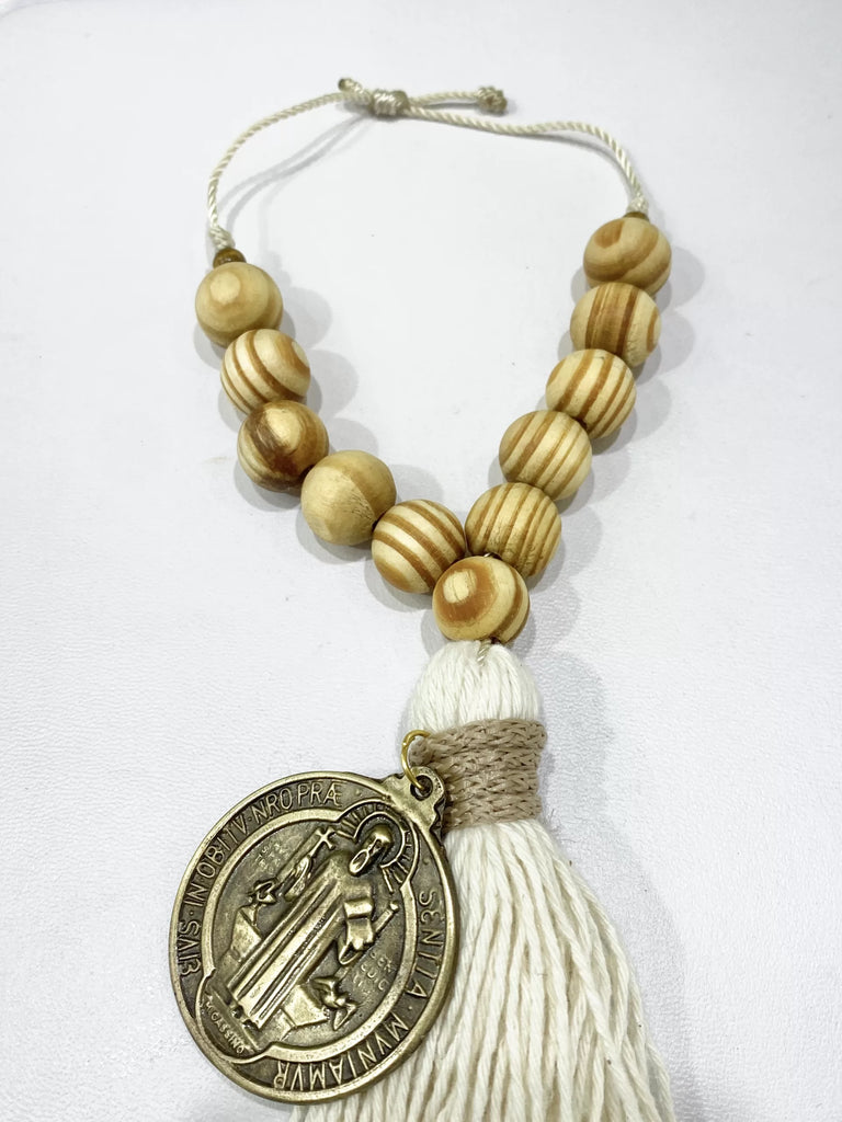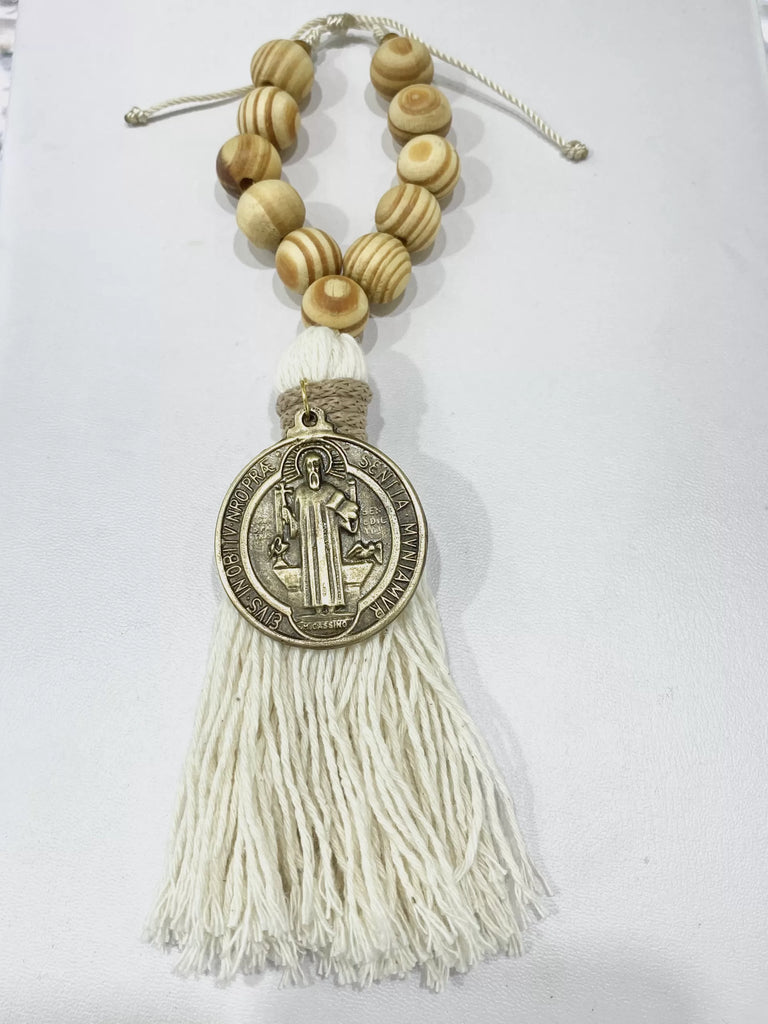 • Descripción: ADORNO BENDICIÓN CON BOLAS DE MADERA Y MOTA DE HILO CON MEDALLA SAN BENITO ABAD