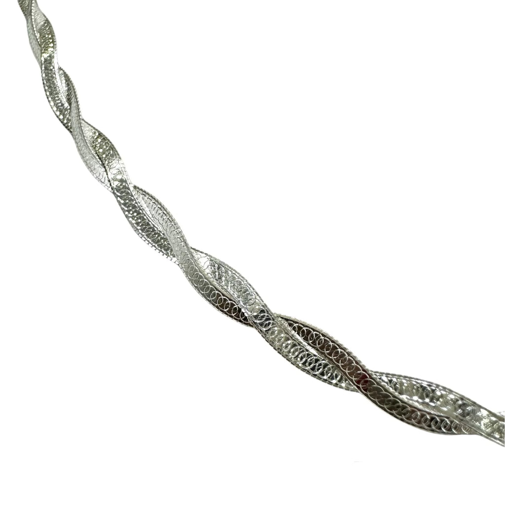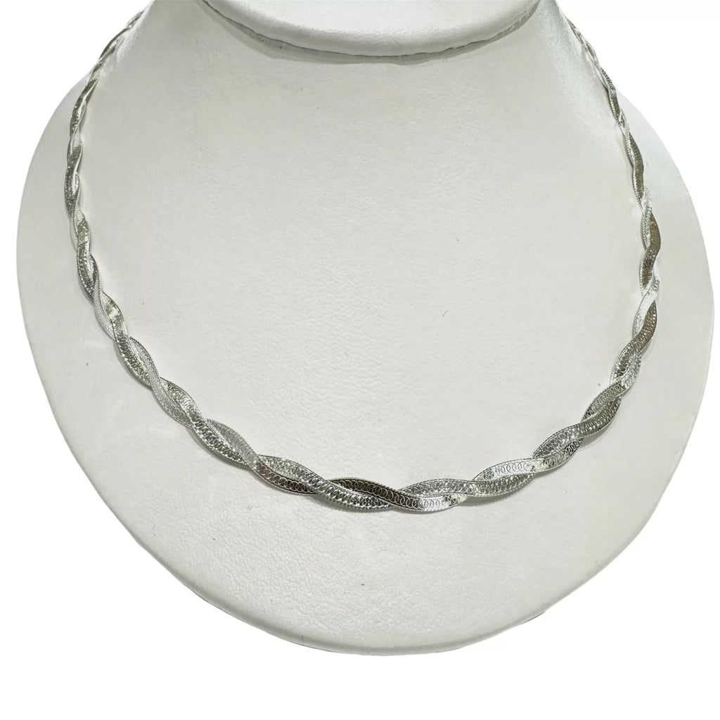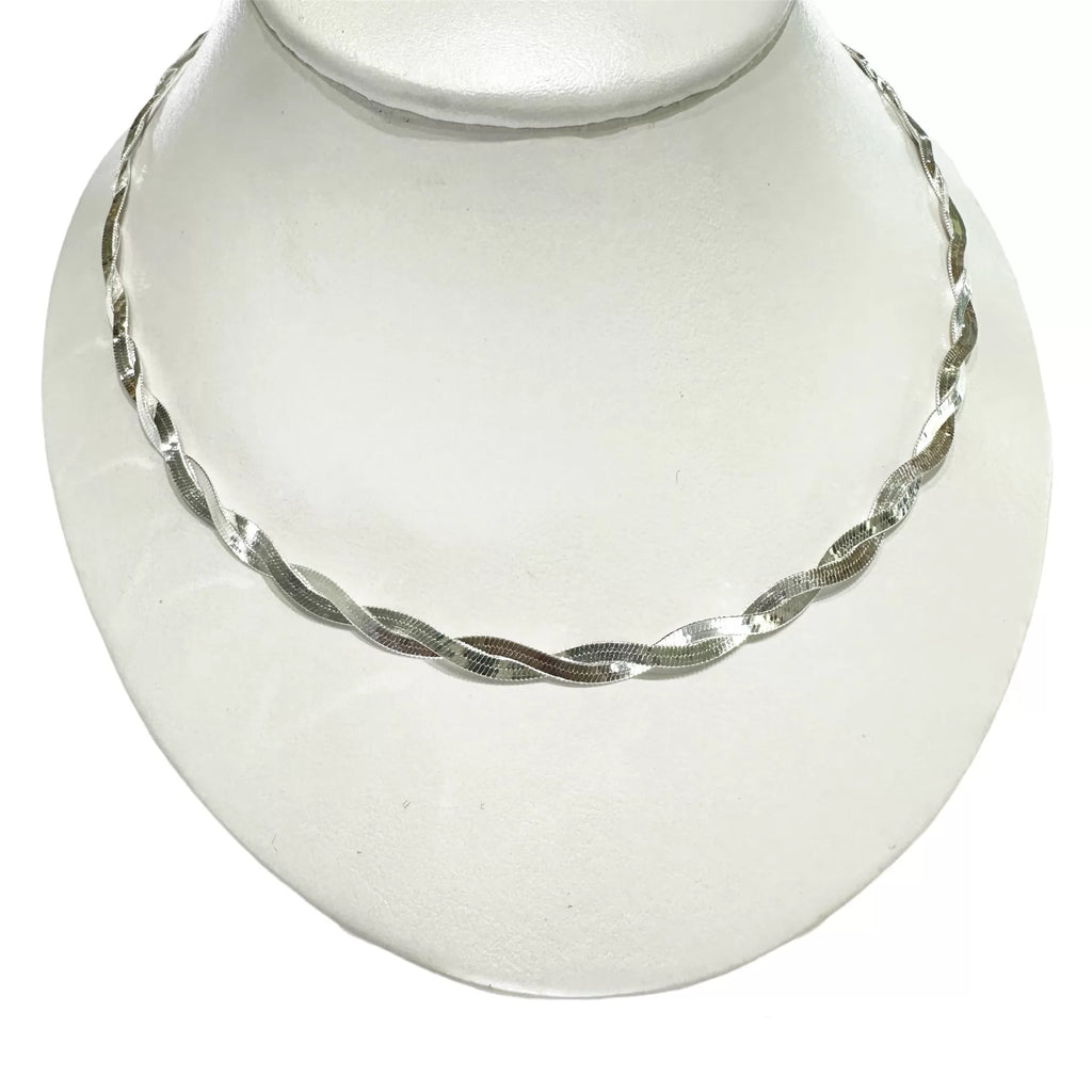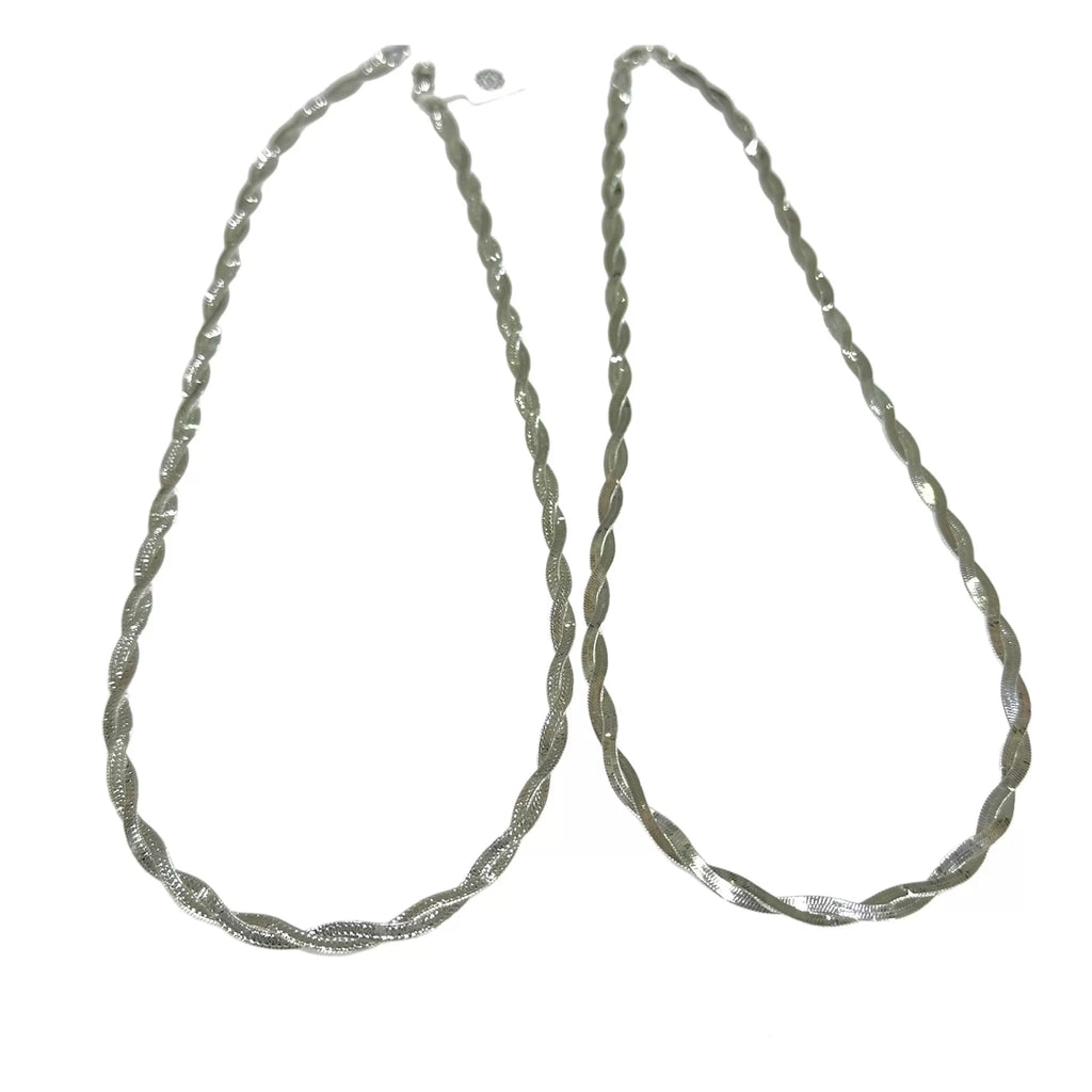 GARGANTILLA DOBLE ENLACE CON DOS VISTAS EN EL GRABADO , UN LADO COMPLETAMENTE LISO Y EL OTRO LADO CON UN GRABADO TIPO OLÍMPICO MUY SUTIL.